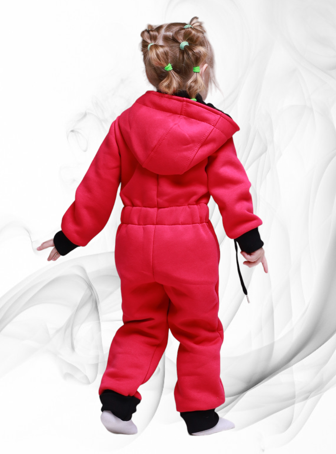 Комбинезон с капюшоном на подкладке, с открытыми ножками, рукавчики на манжете, спереди на косой молнии.
