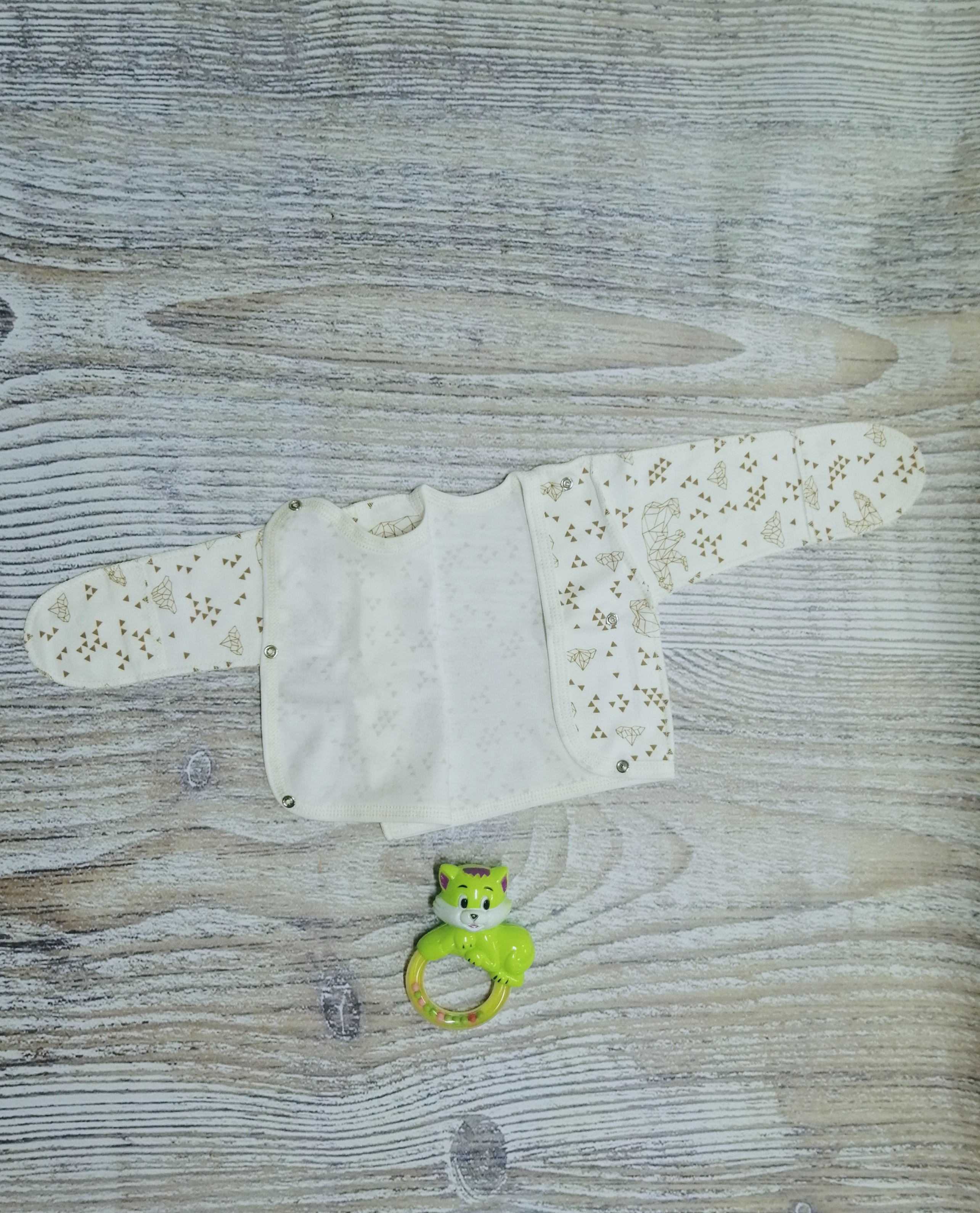 Распашонка спереди с асимметричной застёжкой на трёх кнопочках, рукавчики-трансформеры.